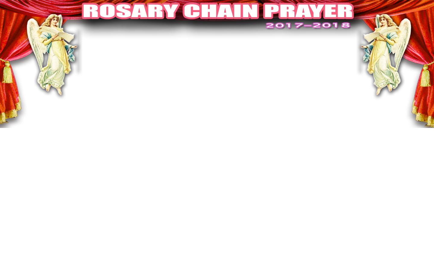 Rekomendujemy, abyś stał się linią w tej modlitwie łańcuchowej, wybierając dowolną godzinę dnia lub nocy na co dzień w październiku 2017 i odmówić różaniec za następujące proponowane intencje. Z przyjemnością poinformuj nas o czasie swojego uczestnictwa w tej modlitwie w Twoim miejscu, pocztą lub pocztą. Zechciej podaj swój adres pocztowy i e-mail, abyśmy mogli się z nimi skontaktować. Wreszcie serdecznie witamy was i twoich przyjaciół, aby uczestniczyć w Konwencji Marianów w Ross Hill, Visakhapatnam, w godzinach 7: 00-17: 00 w dniu 7 października 2017 roku.